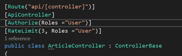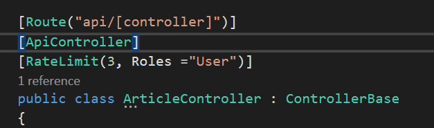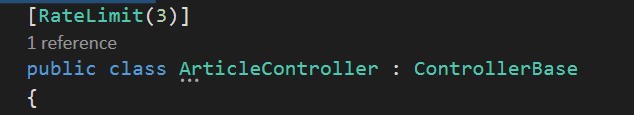 在controller上使用,计数器仍然然会对每个方法单独计数。例如1中的配置,它会使任何一个用户无法在1秒内对articlecontroller中的某一个endpoint方法发出三个以上的请求,但是该用户对articlecontroller所有endpoints的一秒内请求总和可以超过三次