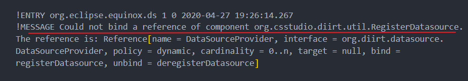 !MESSAGE Could not bind a reference of component org.csstudio.diirt.util.RegisterDatasource. The reference is: Reference[name = DataSourceProvider, interface = org.diirt.datasource.DataSourceProvider, policy = dynamic, cardinality = 0..n, target = null, bind = registerDatasource, unbind = deregisterDatasource]