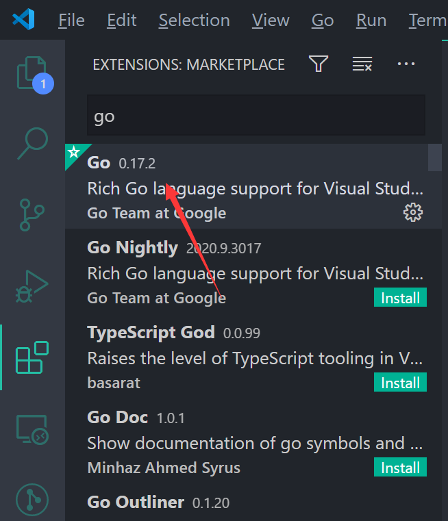 笔者比较喜欢的文字编辑器是vs code,为了在vsc上开发go,我们需要安装go插件。在extensions窗口搜索go即可找到。