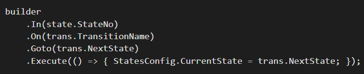 因为状态机所有信息都是动态的,不确定的。所以第一步需要从配置文件把所需要的信息都加载进来,然后调用Appccelerate.StateMachine,新建一个状态机。