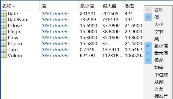 于是笔者根据教材要求,开始在工作区查看数据具体信息,然鹅笔者没有看到书上那么详细的最小值、最大值、均值、极差等等,于是笔者又百度发现,需要右键名称那一行,选择想要看到的具体数据,如下图所示,方可。双击工作区可放大。