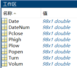 在导入数据界面会在输出类型看到有五个选项,这里根据教材(北航出版MATLAB数学建模方法与实践),我们选择列向量,则出现如图所示显示方式。至此,获取数据的工作完成。