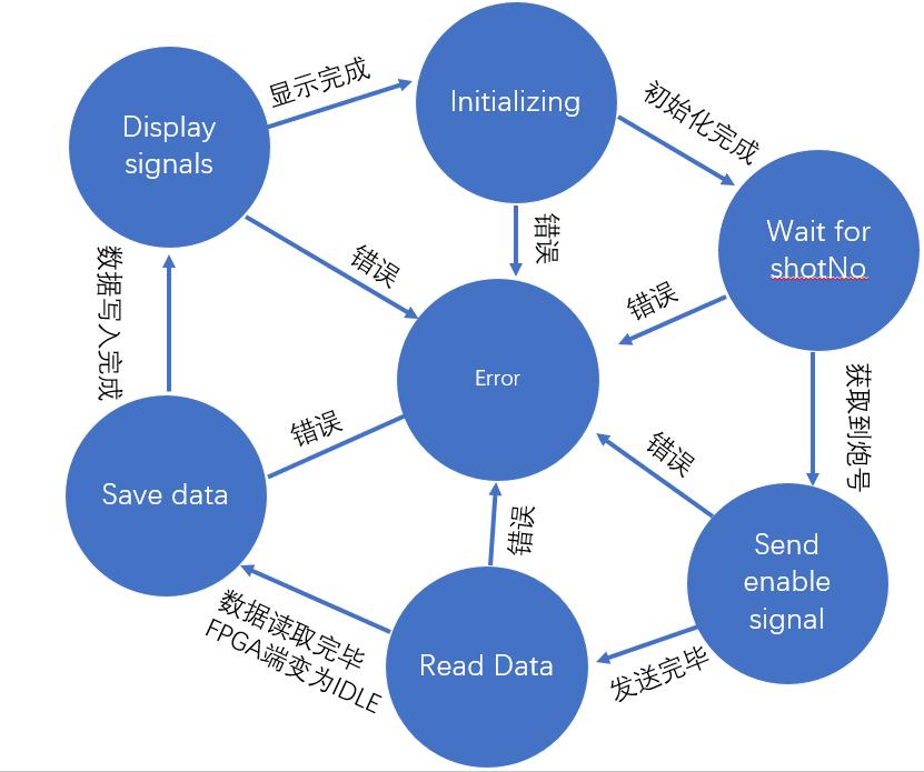 F PGA 端程序设计采用生产者-消费者模式,一个 120M 的时钟,3 0M 的定时循环采用状态机设计对信号进行采集,主要状态有: