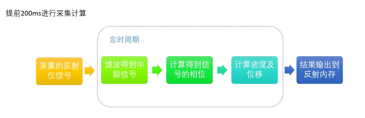 另外一个定时循环用来对采集的信号进行数据处理,包括fft计算相位,计算密度,计算位移。两个循环之间的数据传递采用F IFO 进行数据传递。另一循环状态机设计如下: