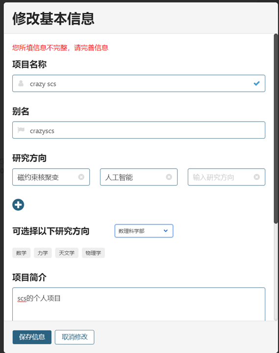 通过建立项目,进行项目管理。可设定项目名称、别名、研究方向、项目简介等。