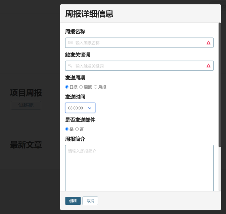 在“项目周报”功能中,可以设置周报的名称,关键词 发送周期等。