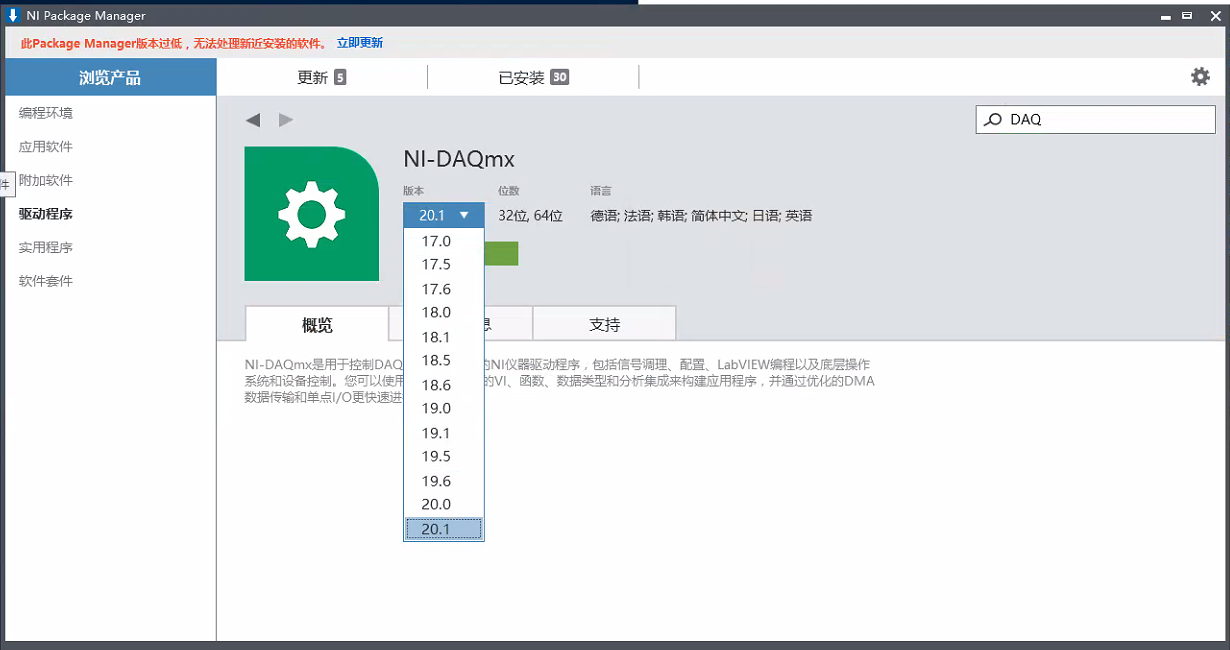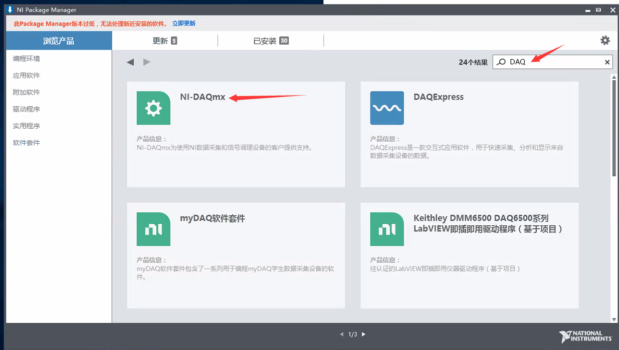 在NI Package Manager搜索驱动资源进行安装。 PS.建议用自己的驱动资源安装,NI资源在线安装失败率极高!