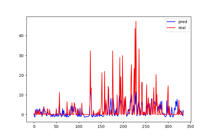 按照每天进行重采样,以一天为间隔,24小时雨量进行累加,压强等特征求平均值,使用重采样后的数据进行训练,效果好了很多。