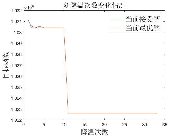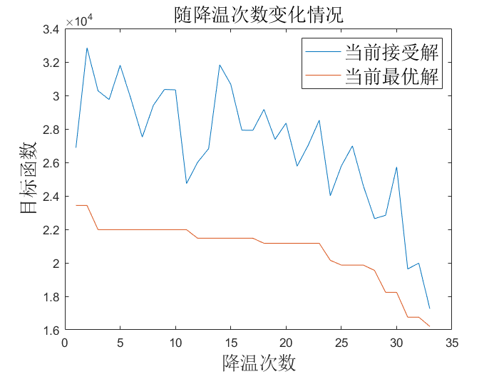 fh.plotDecoration('降温次数', '目标函数', '随降温次数变化情况', ...