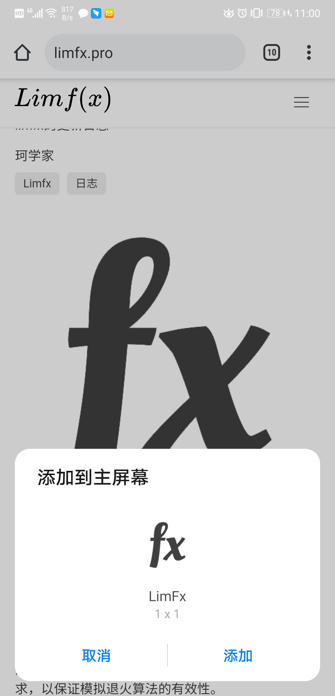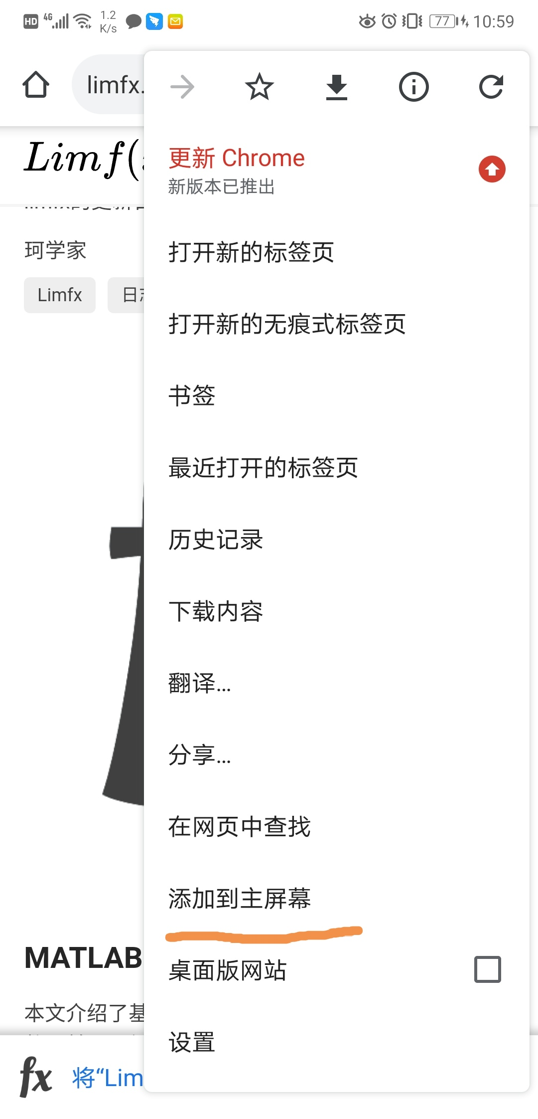 点击下方"将limfx添加到主屏幕"。如果浏览器下方没有弹出这个选项,请在菜单栏中找到它并点击