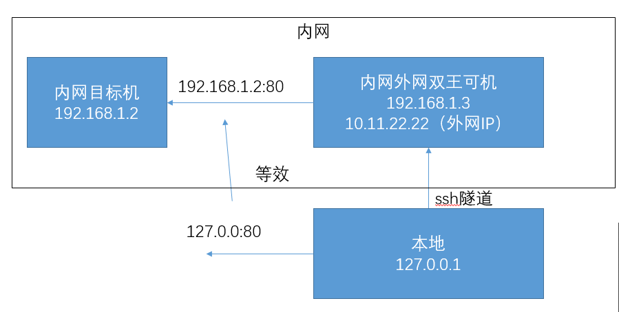 你可以访问本地的80端口就等于访问内网目标的80,好像你们就在一个网里面,而且你不仅仅可以映射相同的端口,你可以映射到任意其他的端口。