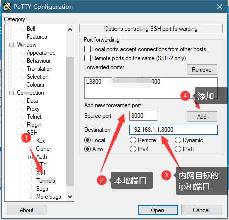 然后你可以通过ssh隧道,把目标机的端口通过ssh隐射到本地。如同下图