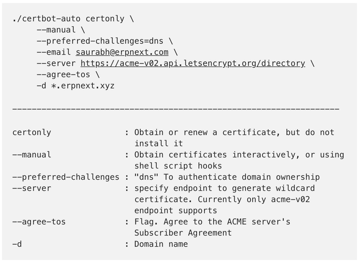 这里面关键是的--manual,要手动模式,和--preferred-challenges dns要你设置dns txt recode来验证你对域名的所有权,然后-d '*.<your.domain>'是你的域名就行。