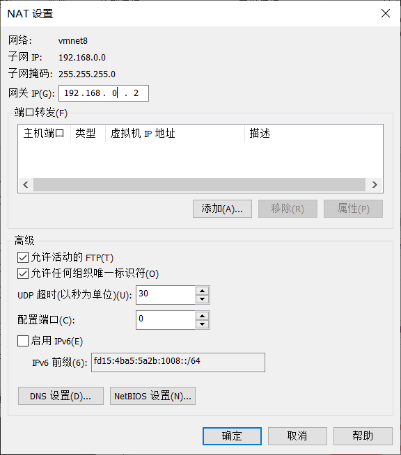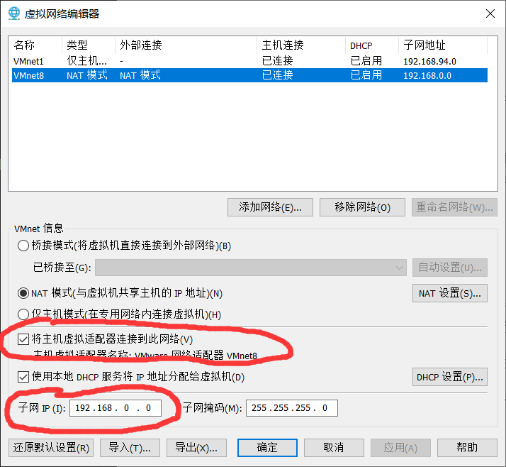 勾选将主机虚拟适配器连接到此网络,并将子网ip改成和主机同一网段。我主机ip为192.168.0.105,在这里就改成了192.168.0.0。