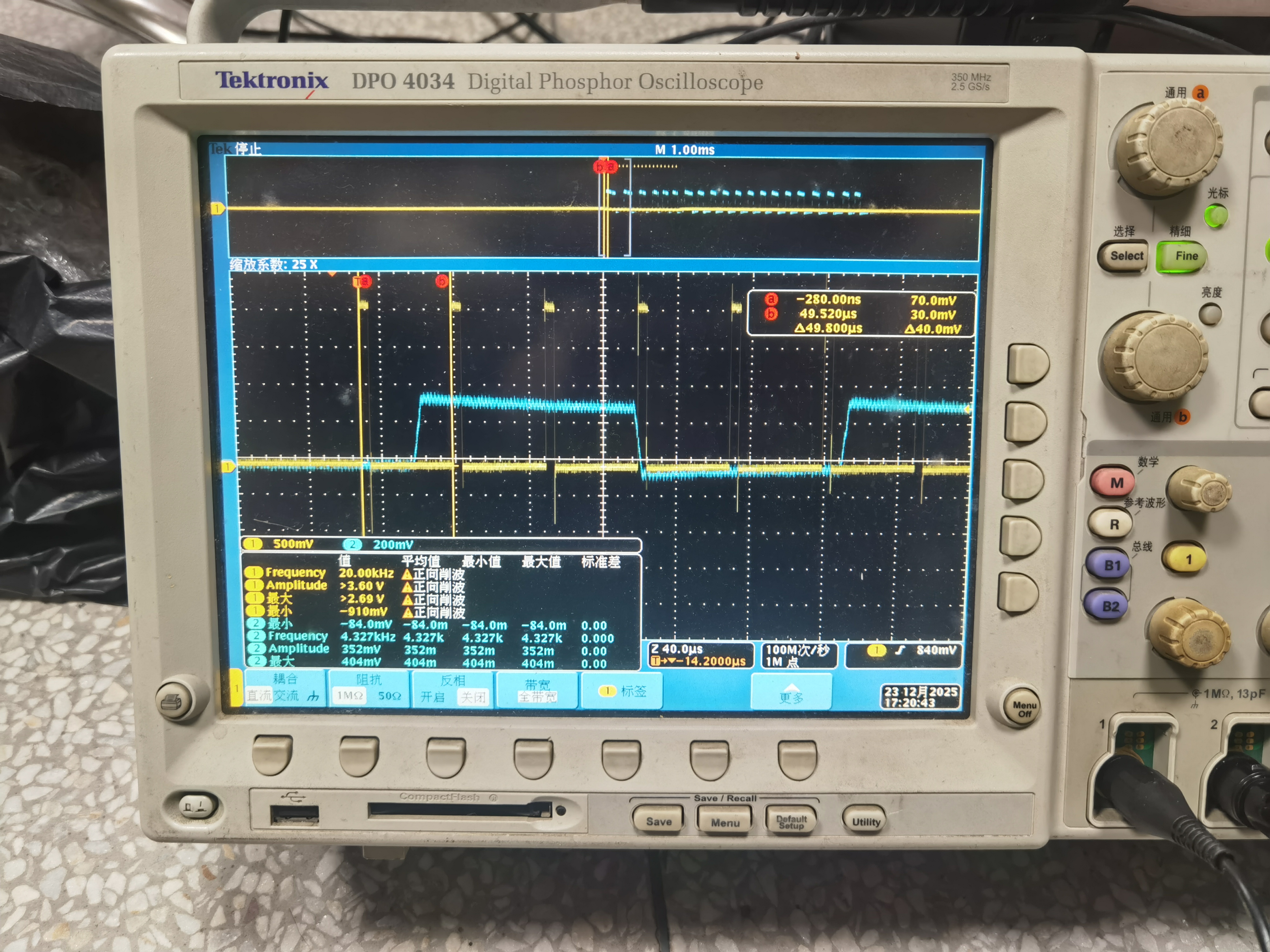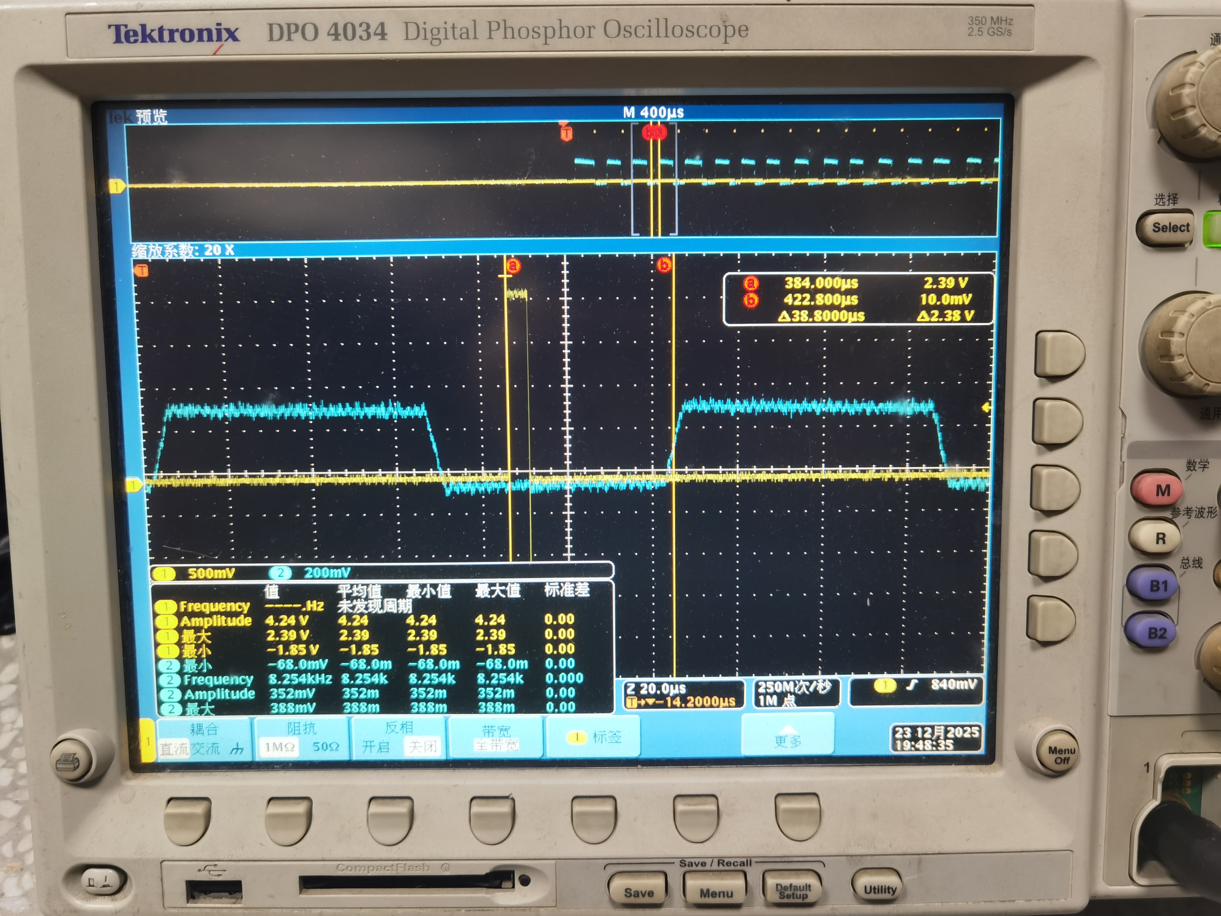测量第一个黄色脉冲信号和第一个蓝色方波信号上升沿之间时延,大约为30us。后面几个周期,信号之间无法同步,可能需要降低采样率。