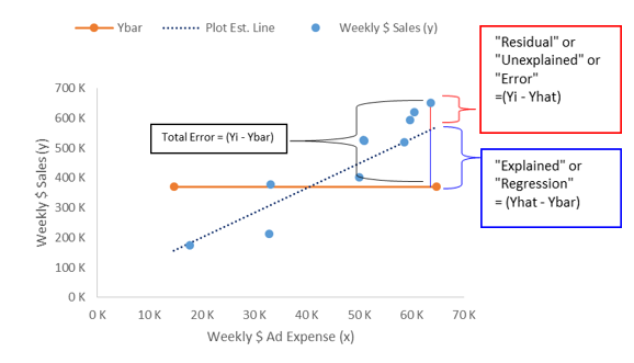 这里可以看到几个数字,最重要的就是rsquare,和adjrsquare,这个代表了你模型解释观测数据的能力,两个数字差不多,如果你只有一个independent variable两个是一回事,如果你有多个变量你关注的因该是adjrsquare(adjusted r square),因为当变量增多的时候rsquare一定会减少,adjrsquare是只考虑significant的变量,这个我们就在这里不多说了。 这个adjrsquare是越接近1越好。 我们在下面的公式和图里面可以看到这个rsquare是怎么算的: