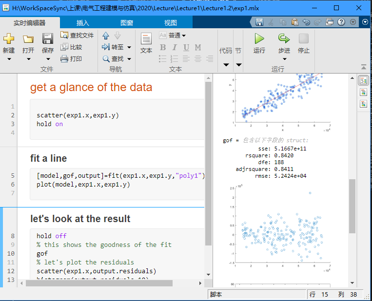 按照这个图里面的,我们首先吧当前工作目录换到我们存放数据的目录,然后再数据excel文件上右键,导入数据,我们可以把表头改成x,y这样我门后面好操作一些,然后再创建一个实时较笨,调用 scatter 散点图命令画出一个图像,可以看到再右侧就出现了一个图片,这个用起来很方便,下面是实际的代码。