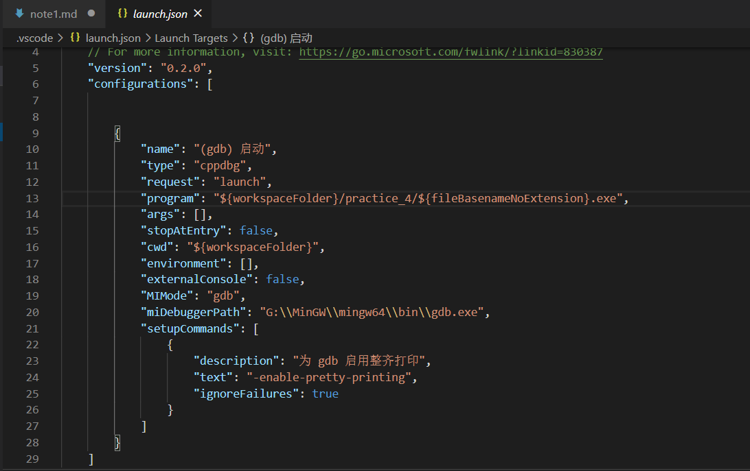 上图中的第20行是debugger的路径,这一部分需要按照自己Mingw-w64的安装路径来填写。