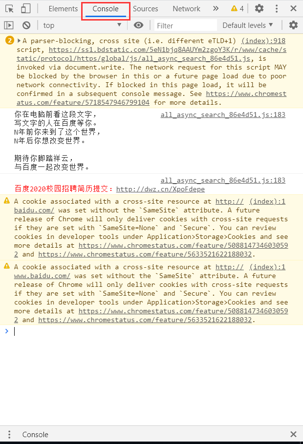 我们在JS中的打印的内容就会被打印在这里,可以看到百度网站打印了一则招聘广告在这里。