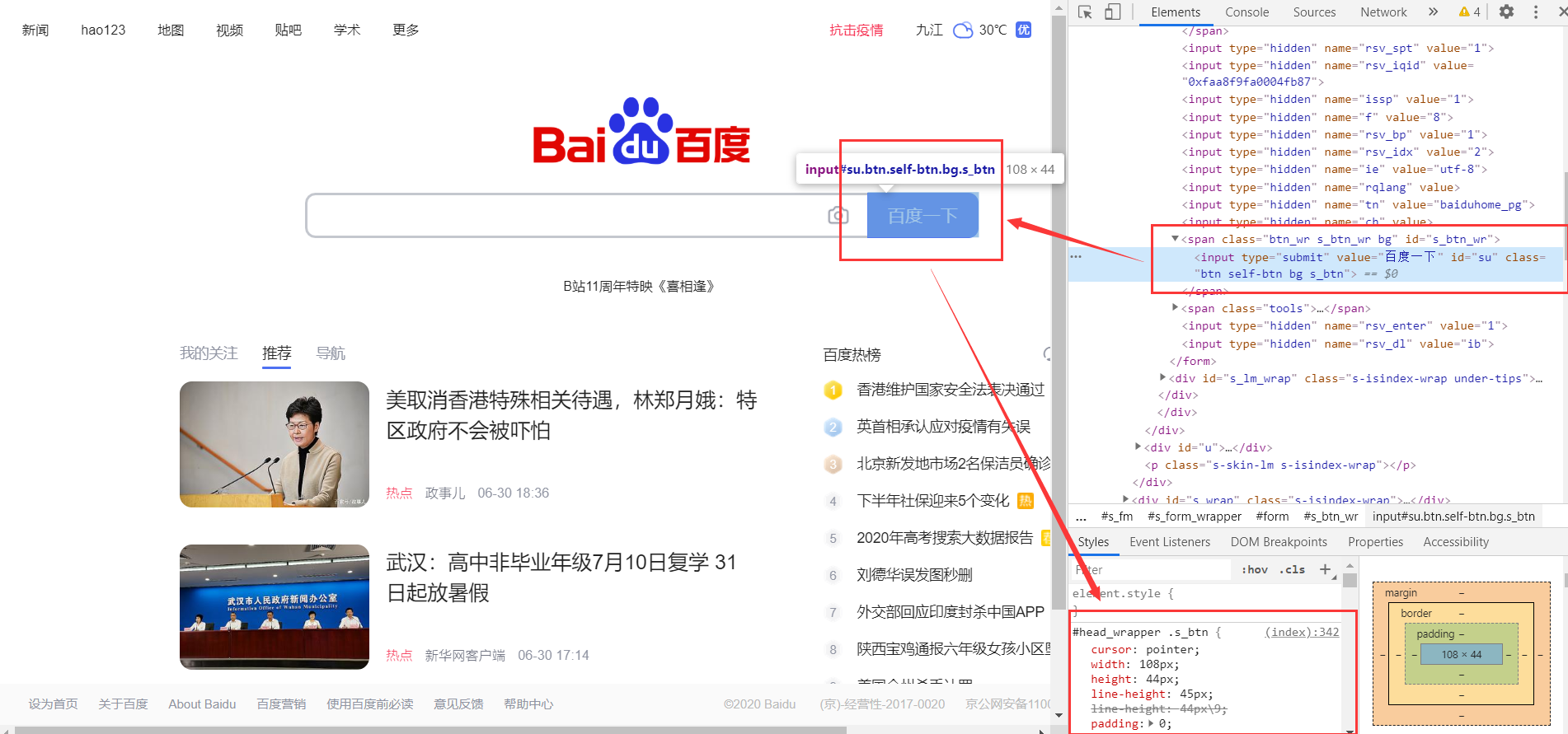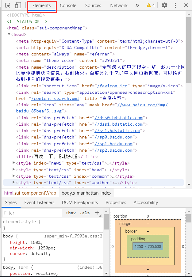 此外控制台还可以看当前网页的DOM结构,比如说你看到一个很牛逼的网站,你想模仿他,你就可以打开控制台,选择Elements:
