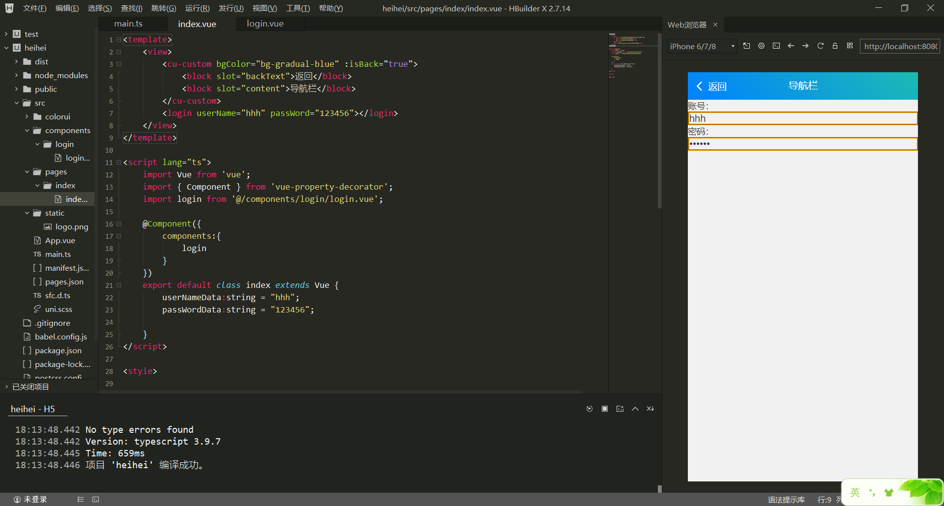 注意我框起来的部分,首先你得需要import你要调用的组件,然后在@Components({})中注册该组件,然后你就可以将login作为标签使用:<login></login>来直接向index中插入我们的组件,效果如上图所示。