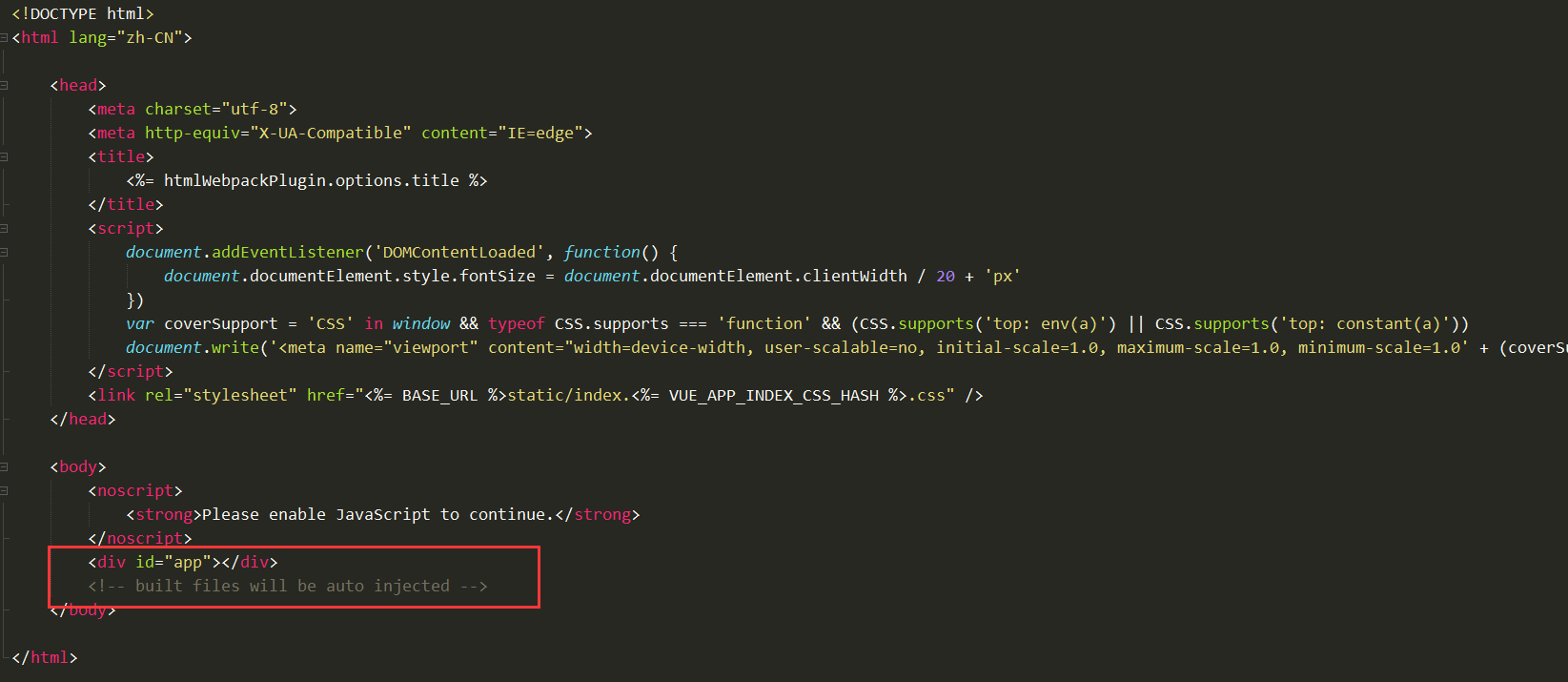 public:public中有一个index.html文件,这是一个模板文件,作用是生成项目的入口文件,我们浏览器访问项目的时候会默认打开这个文件。index.html的内容: