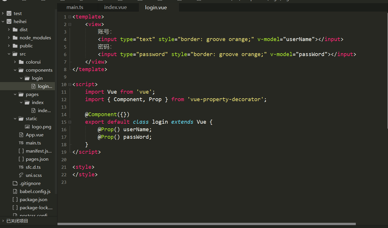 现在我想向login组件中传递数据,之前说过了我们设置了两个属性,现在我们在index中向login中传递数据: