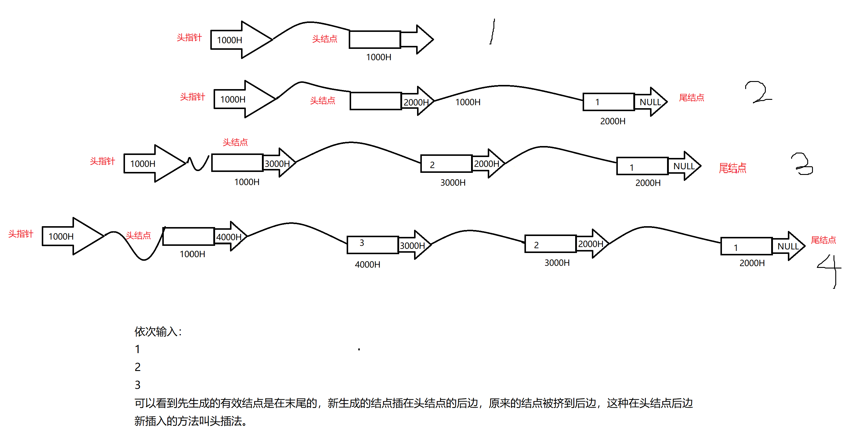 [!NOTE] 上述例子其实是尾插法实现的创建链表, 我把它理解为是按照从头到尾顺序添加结点,永远把新添加的结点的指针域置为空,这样也好理解。
