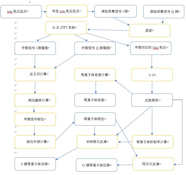 每3 2 个点做一次fft,直到产生中频点,需要三个长度为3 2 的数组暂存stft数组,当找到fft最大值在6- 10 之间且递增则认为产生了中频,并将暂存用于计算中频相位, QX 与V X 数据接到一起进行计算, 对于V X 需注意在低密度,低纵场的情况下可能会频率高的数据直接超出最大密度值,所以需对V X 的数据做stft判断是否飞出中频。